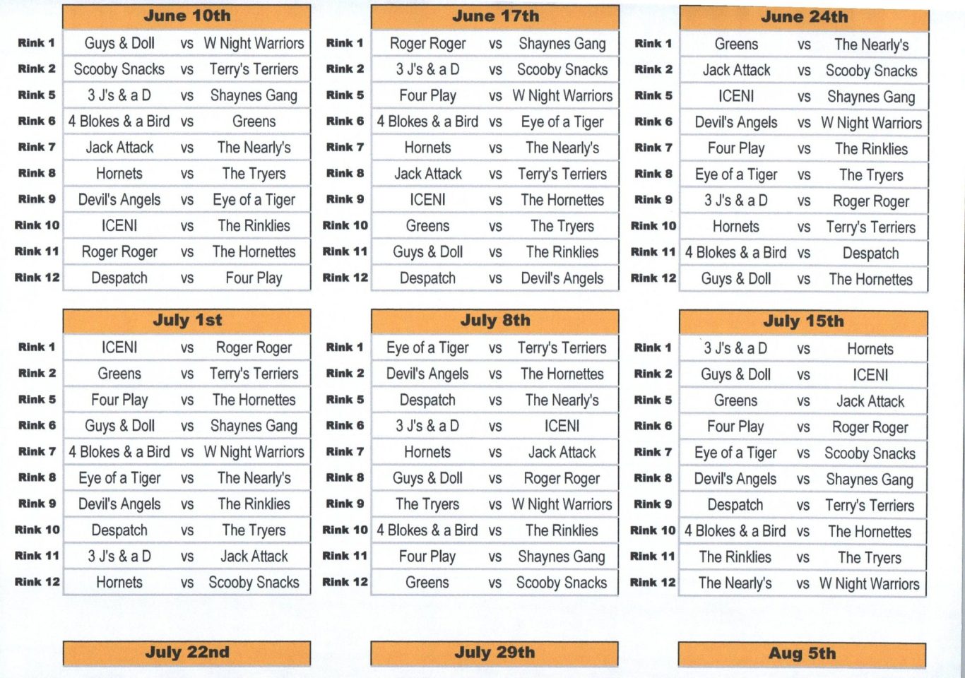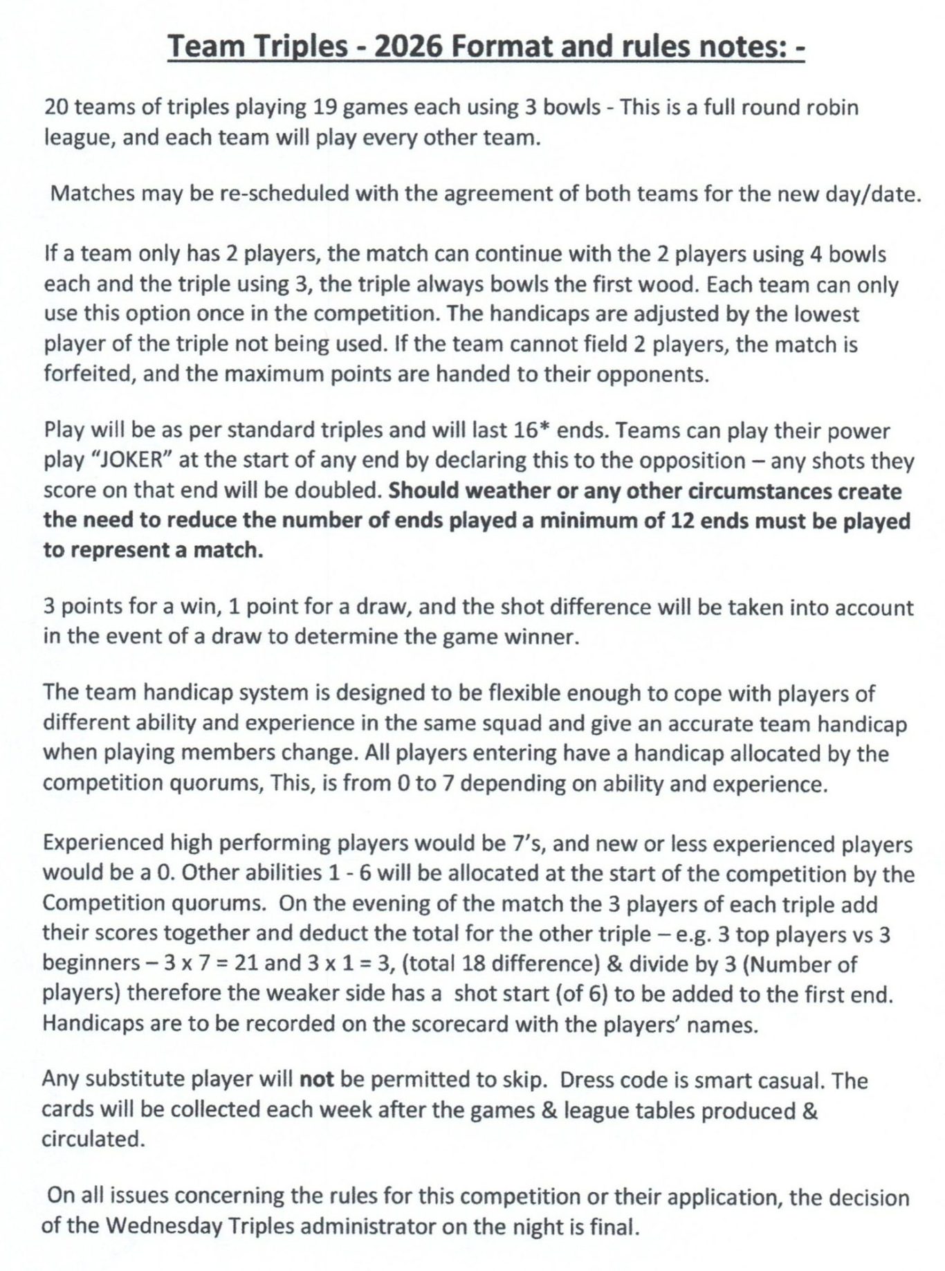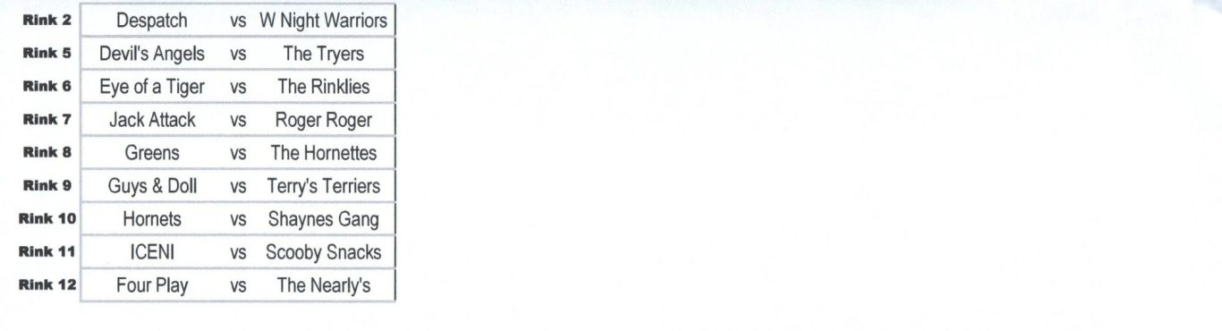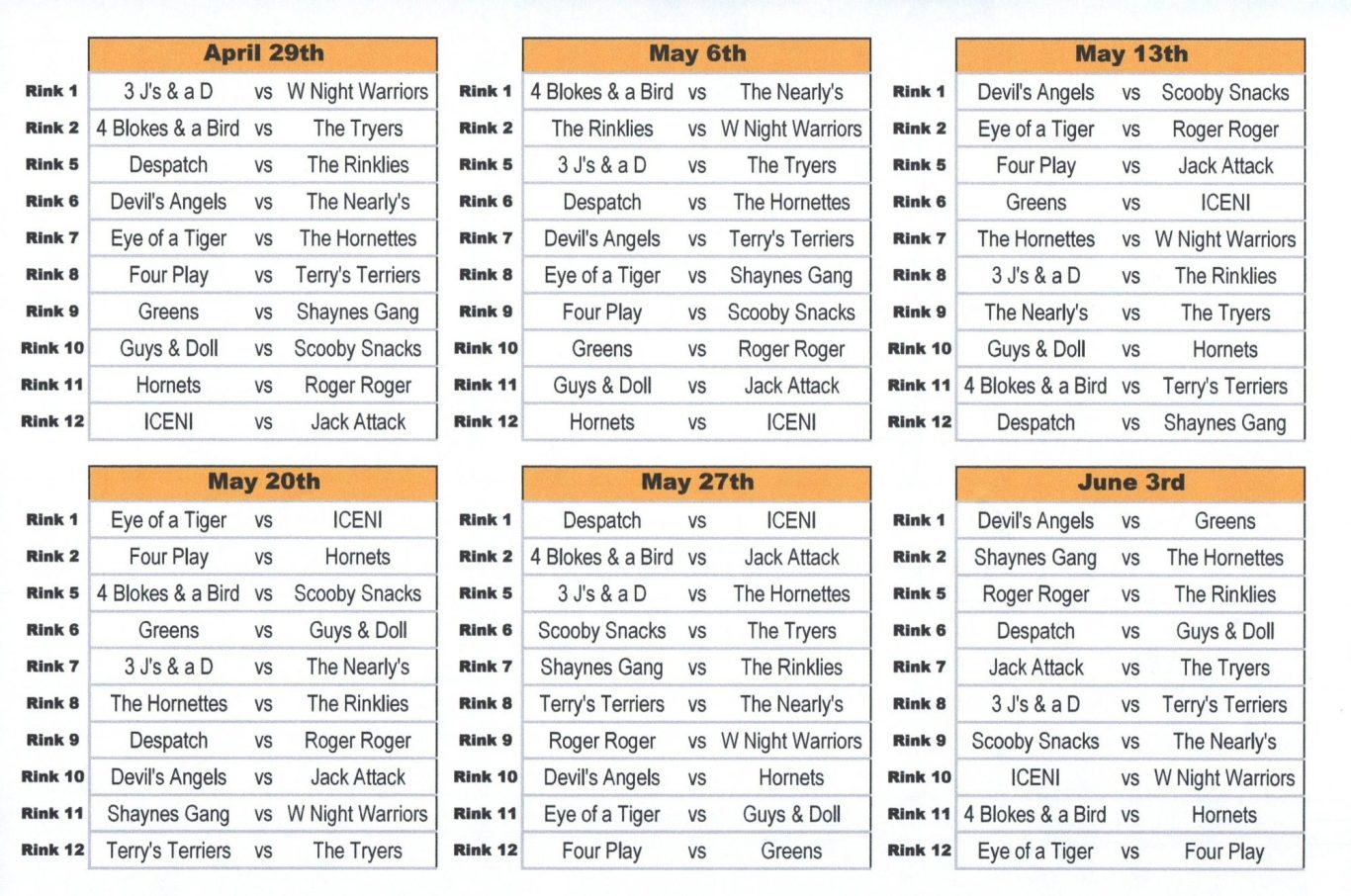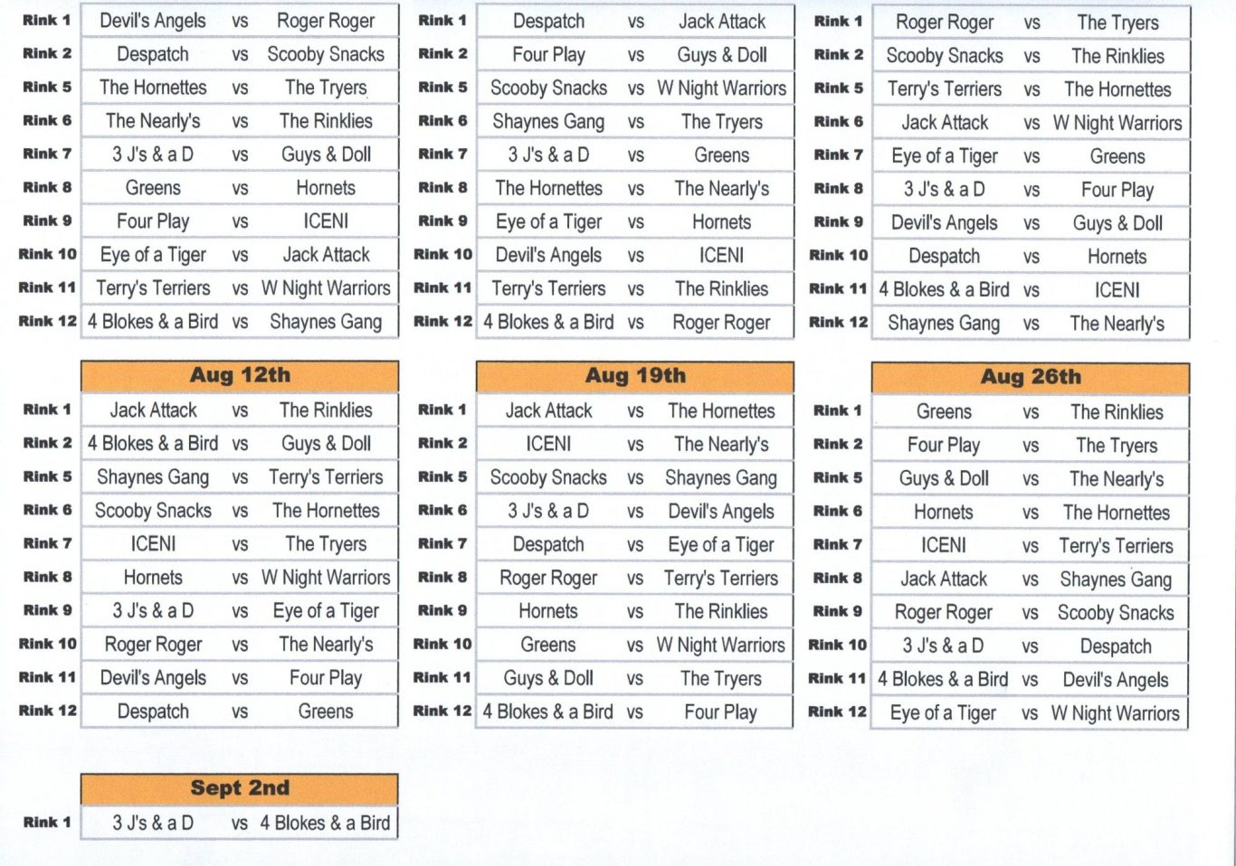 Minimum of 12 ends (otherwise agreed between teams). Maximum of 5 players per team. Reserves very welcome, please register as such on signing on day